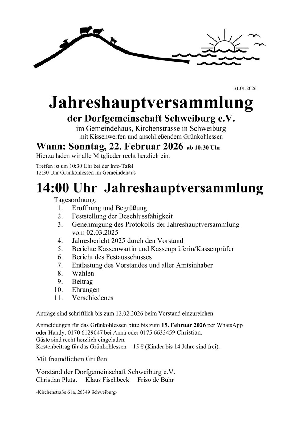Die Jahre Haupt Versammlung der Dorfgemeinschaft Schweiburg e.V. findet am 22.02.2026 im Gemeindehaus statt.